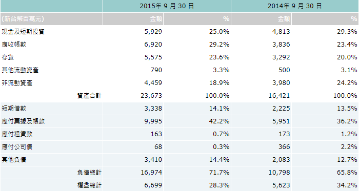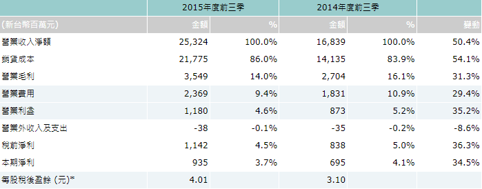 * EPS 以普通股加權平均股數計算:2015年前三季為233,901仟股,2014年前三季為223,983仟股
