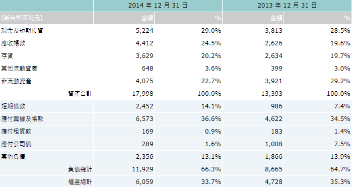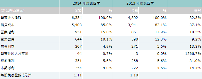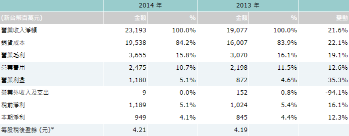 * EPS 以普通股加權平均股數計算:2014年為225,449仟股,2013年為201,730仟股