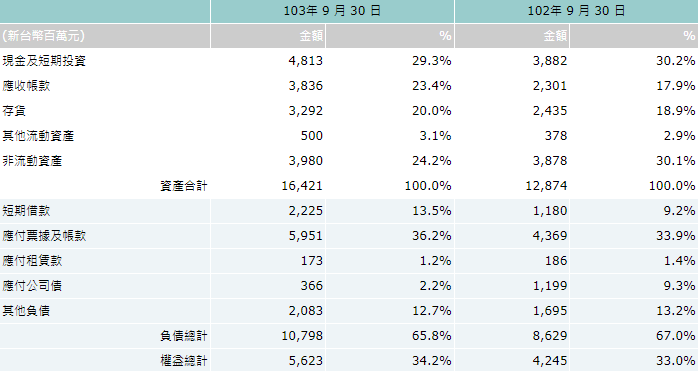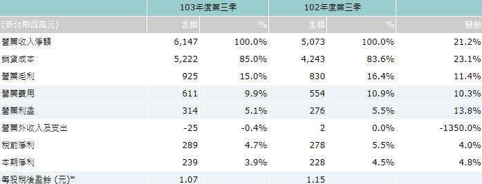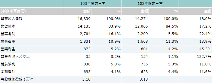 * EPS 以普通股加權平均股數計算:103年前三季為223,983仟股,102年前三季為198,758仟股