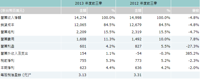 * EPS 以普通股加權平均股數計算:2013 年前三季為 198,758 仟股,2012 年前三季為 192,230 仟股