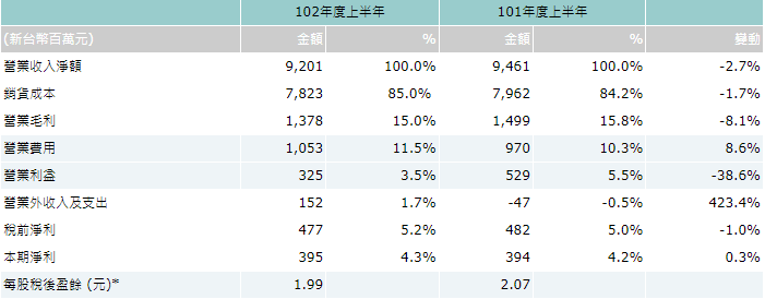 * EPS 以普通股加權平均股數計算:102年上半年為198,447仟股,101年上半年為190,600仟股