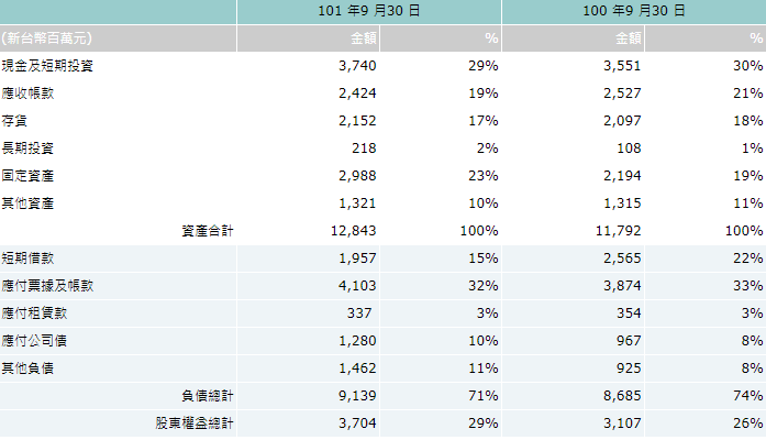 表 2:101 年度前三季合併資產負債表