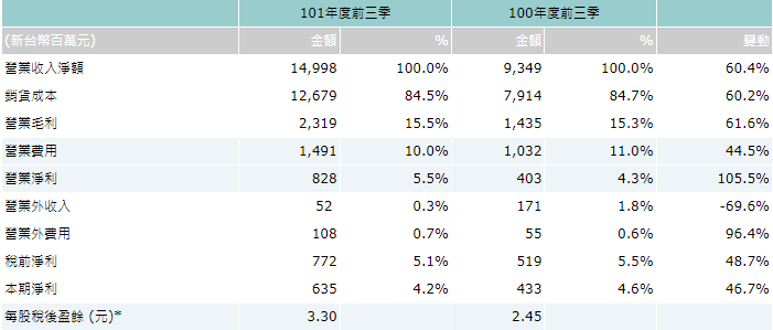 * EPS以加權平均流通股數計算:101年前三季為192,238仟股,100年前三季為177,094仟股