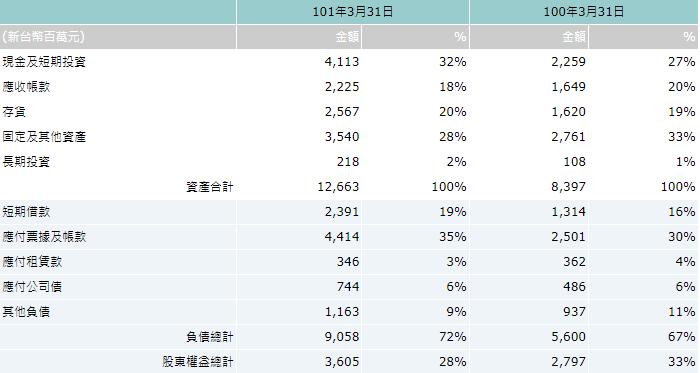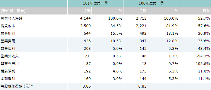 * EPS以加權平均流通股數計算:101年第一季為186,135仟股,100年第一季為173,047仟股