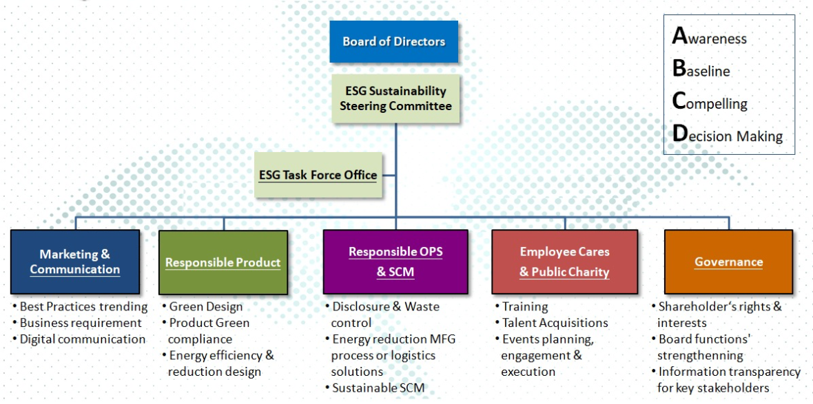2023年5月,經董事會決議,正式成立「永續發展委員會」,為實 踐企業公民社會責任,接軌國際趨勢,積極回應厲害關係人對於環 境、社會及公司治理等面向風險評估與因應對策,以達永續經營之 目標,「永續發展指導委員會」之委員係由董事及公司高階經理人 組成,其職權包括: 制定永續發展方向及目標,並擬定相關管理方 針及具體推動計畫。宣導及落實公司誠信經營及風險管理之相關工 作。企業永續發展執行情形與成效之追蹤及檢視等。